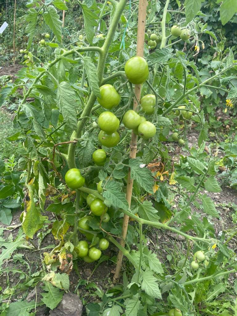After our chat, I planted my tomato seedlings. On a whim, I left one plant completely alone — no watering, barely any weeding, no pruning, no tying. It lay flat on the ground, forgotten. Then on July 30th, I lifted it and tied it up. To my surprise, it was heavy with healthy fruit.